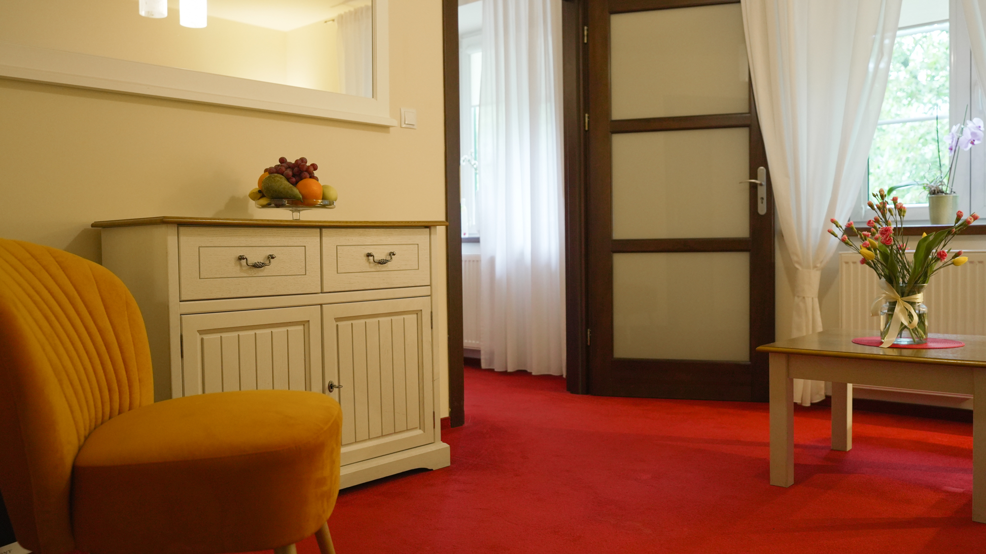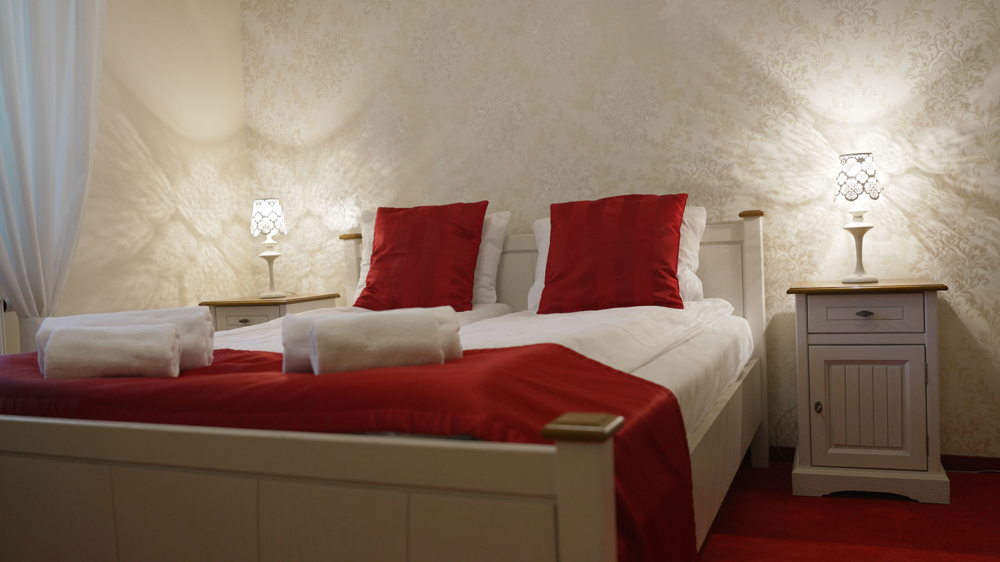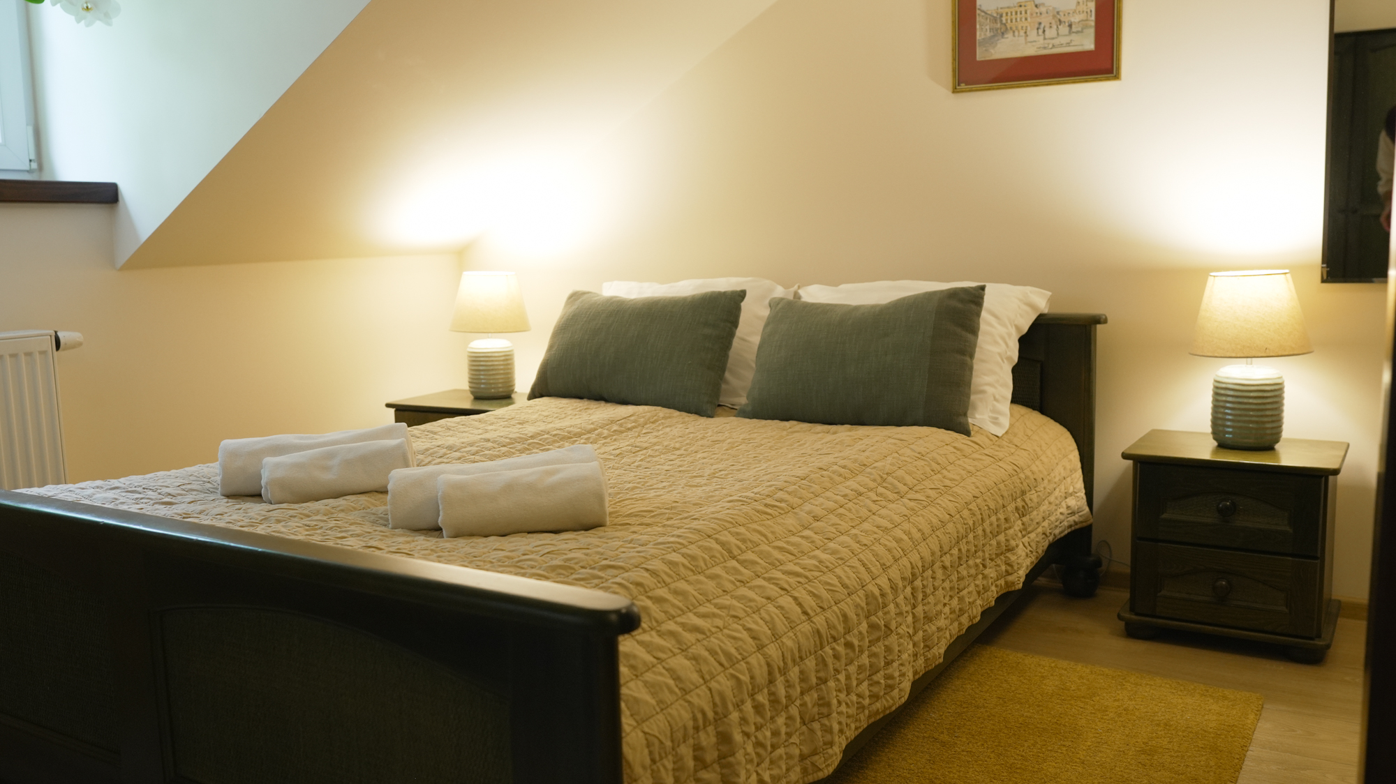 W Serokomla oferujemy 11 komfortowych pokoi, w tym 2 przestronne apartamenty, które zapewnią wygodę i prywatność. Każdy pokój wyposażony jest w łazienkę, a przytulny wystrój sprawia, że poczujesz się jak w domu. Pokoje są przestronne i jasne, a ich okna oferują piękne widoki na okoliczne tereny, w tym majestatyczny Zamek Janowiecki.