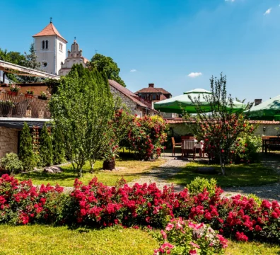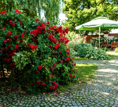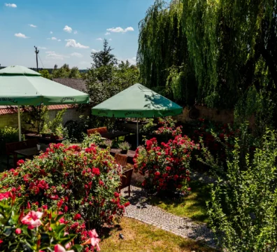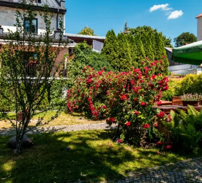 Latem zapraszamy do naszego zacisznego ogródka, w którym można odpocząć na świeżym powietrzu, pod parasolami lub przy grillu. Z ogródka rozpościera się piękny widok na Zamek Janowiecki, a otoczenie kwiatów i zieleni sprawia, że każda chwila spędzona tutaj staje się wyjątkowa. To idealne miejsce, by poczuć bliskość natury, zrelaksować się w towarzystwie bliskich lub spędzić czas w miłej atmosferze.